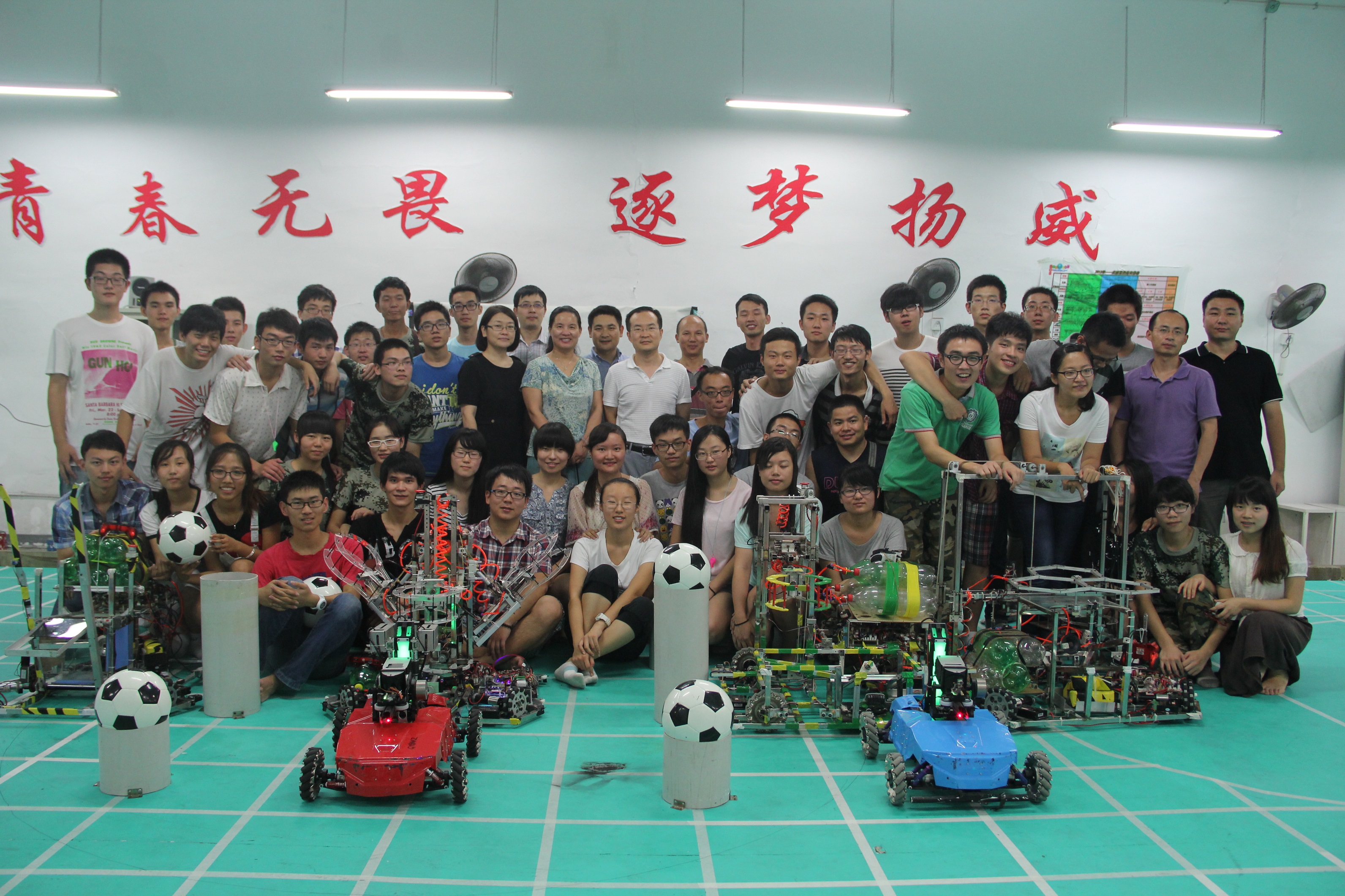 2014年度赛事进行了改革升级,比赛内容包括平台组与竞技组。4月至7月,开展的为创意设计大赛(平台组)的初赛与决赛,要求队员在既有的慧鱼组件平台上,使用各种类型的功能元件,自主创意,并完成硬件搭建、软件编写、作品调试。平台组比赛的目的在于培养兴趣、拓宽视野。平台组比赛在嘉庚四号楼机电工程训练中心电气实训部完成,缘于比赛的趣味性,学生可将自己的创意设计融合在作品中,吸引了众多学生参加。8月至9月下旬,在芙蓉隧道开展了竞技组的比赛,要求队员根据规则开发一机器人,可自动拾取足球并射门。凭着对机器人的热爱和对比赛的激情,8月23日,参赛队员们便提前结束了假期,正式入驻芙蓉隧道开始备赛工作。在近一个月的时间里,队员们根据专业和兴趣安排分工,相互协作,承担机器人作品的机械、电路、算法等开发工作。从构思到落地,队员们用自己的智慧和双手,打造了4台主题机器人。