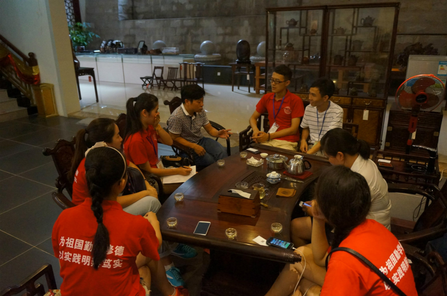 以木作纸,催画入器。实践队第一站到访的是仙游知名企业——群仙文化博览园。纵览企业全景,花园式的外观建筑配合室内古韵仙作,给人们呈现出一幅美轮美奂的仙景画卷。进入展厅,接待员详细地向我们介绍不同的仙作产品。在这里,不仅有我们的古典工艺家具,并有油画、仙游石头、黄蜡石、景德镇瓷器与漆器的艺术,多色产品汇聚一堂,令人目不暇接。参观间隙我们有幸请到群仙企业董事长陈少飞先生,就企业经营方式、设计团队培养以及产业创新方面谈了重要的几点,并与队员们亲切的交谈合影留念。