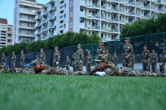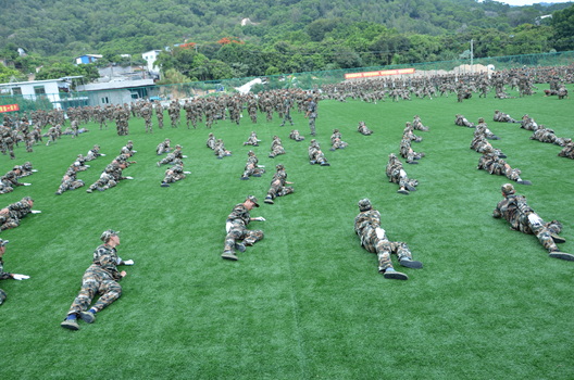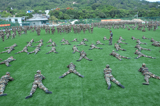 今天开始了新的战术训练项目——匍匐前进。五个教官一起为同学演示匍匐前进的标准动作。
