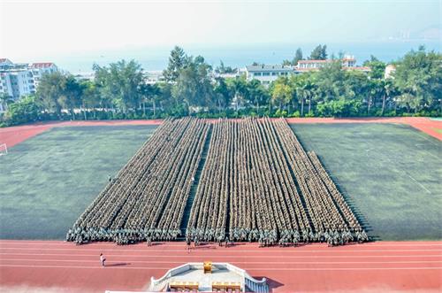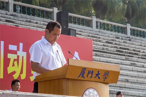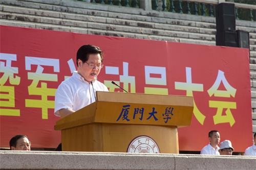 大会首先举行了升国旗仪式,全体起立面向国旗,庄严肃穆,在上弦场唱响了中华人民共和国国歌,第一项议程结束后,朱崇实校长发表了精彩的致辞,朱校长首先代表厦门大学向来自五湖四海的4677位本科新生表示了热烈的欢迎以及诚挚的祝贺,接下来他表达了对新生努力把自己锤炼成国家栋梁、社会精英,为中华民族的伟大复兴贡献力量的期待。为此,他给在场的新生提出了保持谦虚的美德、常怀感恩之情、有强烈的历史责任感、保持奋斗的意志、拥有健康的体魄这五点希望。朱崇实校长特意强调了教育的最高目标,他提到“教育的最高目标是培养一个完整的人,感恩是一个完整的人最重要的部分。”在讲话的最后,朱崇实校长由衷期望虚心向教官学习,要服从命令、听从指挥、团结互助、克服困难、夺取胜利。朱崇实校长讲话刚一结束,台下便响起了雷鸣般的掌声。