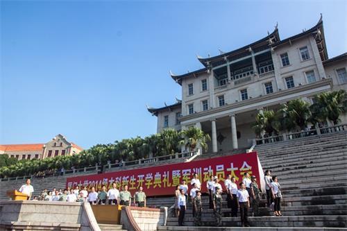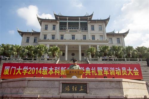 2014年8月28日上午8点整,厦门大学2014级近5000名本科新生整齐有序集结在上弦场,参加了新生开学典礼暨军训动员大会,中国人民解放军领导和将士、校党委书记杨振斌、校长朱崇实、校党委副书记、纪委书记赖虹凯、副校长邬大光、副校长詹心丽、副校长叶世满、校长助理、基建处长张建霖以及学校相关机关部处负责人,各学院党政领导,师生代表出席了本次大会,本次大会的主持人是厦门大学党委副书记林东伟老师。