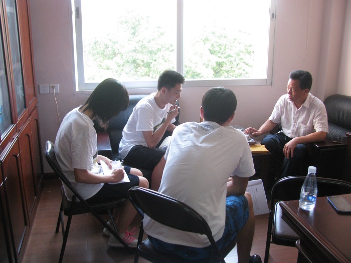 午饭过后,稍作休息,实践队队员们便动身前往永春县政府。第一站是永春县经济贸易局,纪检组长苏志伟热情地接待了队员们,并在办公室与队员们亲切地交谈。通过采访队员们了解到,达埔镇有着300多年的制香历史,2013年仅制香产业的产值已达27亿,约占全县GDP 的7%。GDP巨大的原因之一便是达埔的香产品市场广,除西藏外其他省市均有销售点,并且产品还出口台湾、东南亚国家和兴盛佛教的国家。同时,为了鼓励制香产业的发展,政府出台八项扶持政策,给予大小型、个体小户制香商户适当补贴,鼓励个体工商户转型升级。由于广告费用巨大,香产品的宣传途径通常为推介会、佛事展、制香年会、报纸媒体(泉州晚报、福建日报等),原则是“政府搭台,企业唱戏”;而早期的宣传主要依靠推销人员外出和地区销售总代理。从2012年起,永春县便着手申报“香都”,产业也由朝拜用香转型至较为高档的休闲养生香,注重增加产品附加值,一些制香企业也计划推出工业旅游项目。2013年,政府举办了评选制香工艺师、香道师等活动,旨在选拔优秀人才并进行后续培养。近期,政府与省质监局进行合作,计划建设质量检测中心。虽然永春达埔的制香产业规模宏大,但目前仍然存在一些不足之处,例如家庭作坊下的资金断层。
