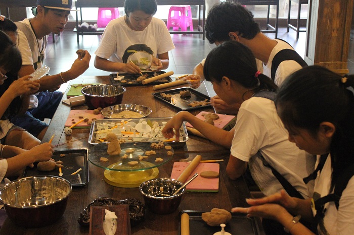 随后实践队队员们坐下来静静观看了独具特色的香道表演。两位衣着典雅的焚香师坐到香案前,首先为队员们一一介绍了焚香的器具,包括香匙,香扫,香压等等。接下来,在悠扬的琴声中,焚香师为队员们演示了装填香粉,香料,印花等。在DIY制香区域,队员们兴致盎然地亲自动手和香泥,运用各种模具,或是自己捏制,制作了形态各异的香品。
