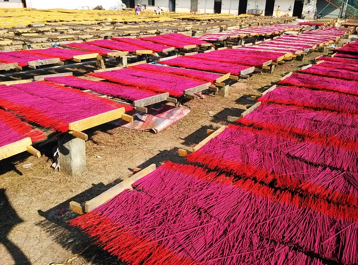 在与彬达相近的香品参观后,实践队更着重参观了兴隆的制香厂房。传统的制篾香手工艺,需经历过水、搓黏粉、打底浸水、展香、抡香、晒香、染香脚、晒香脚等繁琐工序,环环紧扣。如今制香虽不如古法制香那么繁复,但依旧有众多工序,单是挑拣竹签次品的房间,就有四位工人在快速工作。接下来香泥被运到各类车间,有的被转成盘香,有的被制成线香,有的像面条一样,被直接切成无签香,置于隔板中风干。而阳光充足的室外,则有成片的晾晒场,解说员解释说,无签香因为没有固定形状的竹签,所以不能暴晒,否则可能会弯曲断裂。晾晒场也有数名工作人员,有的在将一捆捆线香铺展开来,有的在用染料为线香尾部的竹签上色。无论走到何处,空气中都萦绕着浓郁而不刺激的香味。