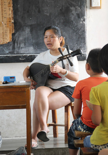 在与黄校长的对话中实践队员得知当初四都小学开设南音班最大的困难就在于师资力量的缺乏,而感动之一就是四都小学里有那么一位在发挥余热教授南音的退休老教师,曾经的四都小学校长。这是一份没有酬劳的工作,在物质至上的今天,他们坚守的正是内心那份对于南音的热爱和对南音文化的珍视,教育这条纽带把南音文化从上一辈人手里递到他们的后代手中。同时,这里还有一位年轻教师,口传心授着这南音,曾几何时,她也只是这里的一位学生,或许南音总能给他们同样的感动,传承着这文化。