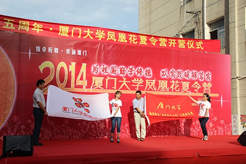 7月25日上午,凤凰花志愿服务团队员们乘车顺利抵达厦门市翔安区珩厝小学。当天下午,凤凰花志愿服务团在珩厝小学举行2014年厦门大学凤凰花夏令营开营仪式。翔安区政府副区长林奕田,翔安区团区委副书记邱荣锋,翔安区教育局副局长陈可芳,翔安区新店镇党委副书记叶捷频,共青团翔安区新店镇委员会负责人罗斌,珩厝社区党支部书记王军垦,厦门大学校长助理、翔安校区党工委书记、管委会主任李初环,厦门大学翔安校区党工委副书记、管委会副主任高忠华,厦门大学校办副主任、翔安校区办主任刘立荣,厦门大学外文学院党委副书记杨云良,厦门大学校团委副书记、翔安校区团工委书记洪海松,厦门大学凤凰花社创社社长、2010-2013年厦门大学凤凰花志愿服务团领队詹伟峰,厦门大学公共卫生学院团委副书记张宇斌等领导嘉宾共同莅临活动现场。在开营仪式上,林奕田副区长、李初环老师共同为凤凰花夏令营授旗,高忠华老师宣布2014年厦门大学凤凰花夏令营正式开营。厦门市翔安区新店镇团委、中国移动福建公司翔安分公司、厦门市阳光视线眼镜有限公司在现场捐赠仪式上为本次夏令营志愿者及营员们捐赠大量学习及生活物资。随后,志愿者及营员代表分别上台宣誓,立志在接下来为期七天的夏令营活动中尽己所能,以实际行动与优异的成绩为厦门大学凤凰花夏令营献上五周年贺礼。