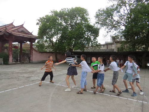 在为小学生带来新奇知识的同时,支教队员们也为大家带来了精彩的素质拓展训练,力促小学生们德智体全面发展。夏令营第二天和第四天的下午最后一节都安排了素质拓展,小学生被分成十组,分别在实践队员的带领下进行各项游戏。有玩老鹰捉小鸡的,有玩解手环、丢手绢、跳火车、萝卜蹲的,还有专为文静的小学生设的“心理座谈会”,多样的选择,兼顾小学生在性格和兴趣方面的差异,保证他们每个人都能找到自己喜欢的项目,让他们都能在素质拓展中积极塑造团队协作精神与积极向上的生活态度。