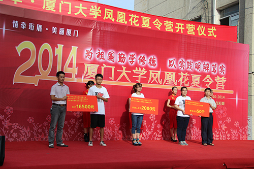 在开营仪式上,林奕田副区长、李初环老师共同为凤凰花夏令营授旗,高忠华老师宣布2014年厦门大学凤凰花夏令营正式开营。厦门市翔安区新店镇团委、中国移动福建公司翔安分公司、厦门市阳光视线眼镜有限公司在现场捐赠仪式上为本次夏令营志愿者及营员们捐赠大量学习及生活物资。随后,志愿者及营员代表分别上台宣誓,立志在接下来为期七天的夏令营活动中尽己所能,以实际行动与优异的成绩为厦门大学凤凰花夏令营献上五周年贺礼。
