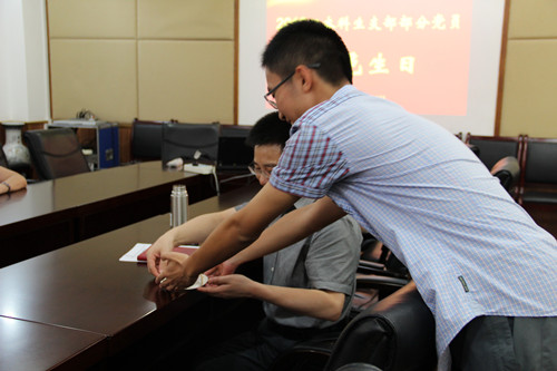 随后,院党务秘书张彬老师也与各位党员们分享了自己的故事。他于2004年成为党员,如今已入党九年,从2011年开始转为党务工作者。从一名“红色生日”会的参加者转变为如今“红色生日”会的组织者,张彬老师感触良多。他与在座众多学生党员们分享起自己与党员同事们在工作之余共同去照顾空巢老人的故事,用亲身经历勉励各位新党员要坚持付出,不求回报。