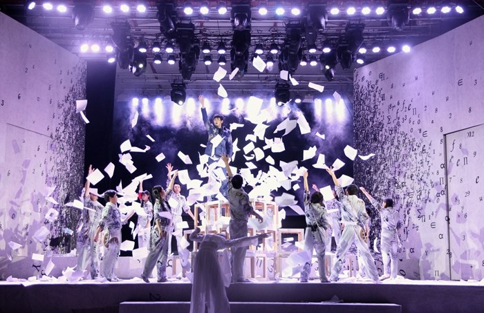 所以舞台处理上以虚代实,以虚拟手法代替实际空间,整个舞台就像一张巨大稿纸,立体的草稿纸,而数学家只需一张纸一支笔。