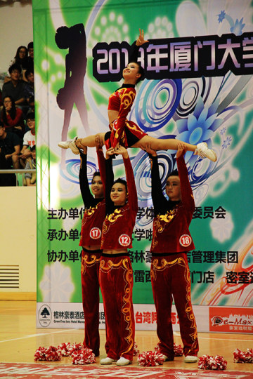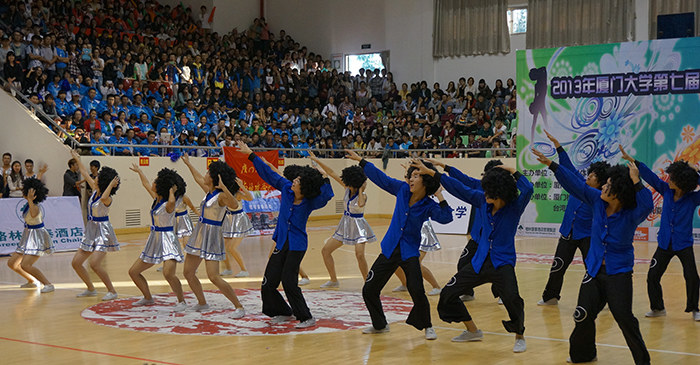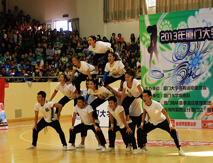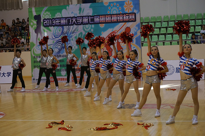 11月17日下午两点30分,厦门大学第七届啦啦操锦标赛在一片欢呼声中拉开帷幕。22个学院的啦啦操代表队以饱满的热情和精神面貌跑入赛场。体育教学研究部郭书记为本次比赛致辞后,啦啦队员们在啦啦操教练的带领下开始一段热身运动,现场的气氛也随之变得火爆,在各学院观众群此起彼伏的口号声中,啦啦操比赛正式开始。