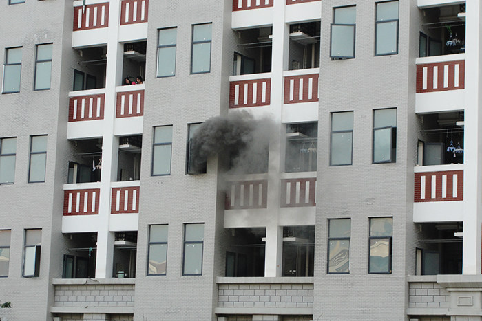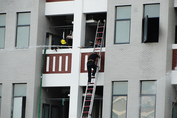 下午4:30,只见滚滚浓烟从芙蓉二308宿舍的窗户冒出,表明“火灾”已经发生,演练正式开始。