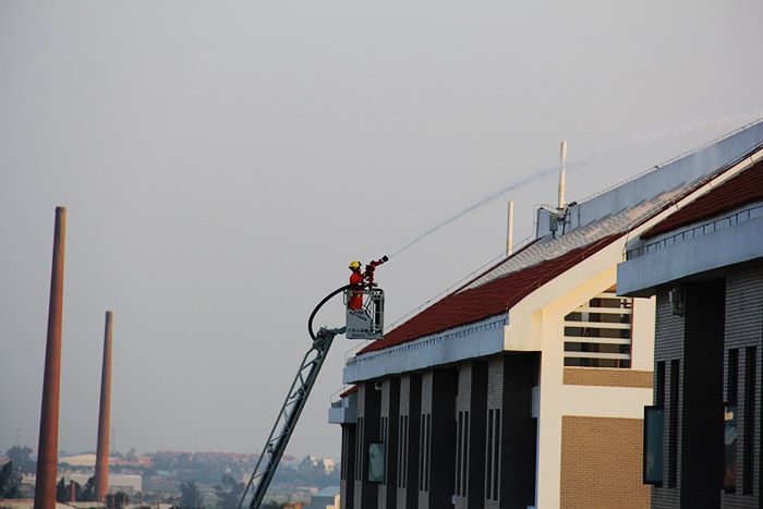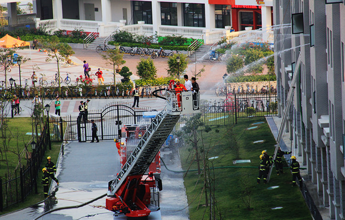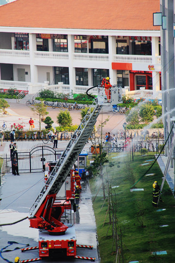 赶来的消防云梯车徐徐升起,对被困于五、六楼的同学进行救援。