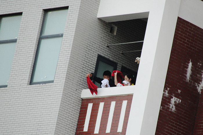 现场情况非常紧急,有数名同学分别被困于三楼、五楼和六楼,被困同学用湿毛巾捂住口鼻并用鲜艳的红布摇晃发出信号进行求救。