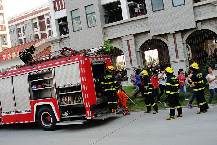 在同学们疏散的同时,消防队员们已经将消防车开到现场并开始准备相关消防设备。