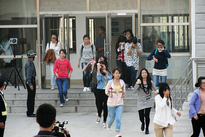 芙蓉园区的同学们在老师和负责同学的引导下有序地下楼疏散,并前往安全地区集中。