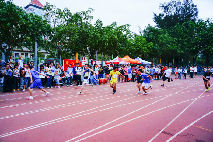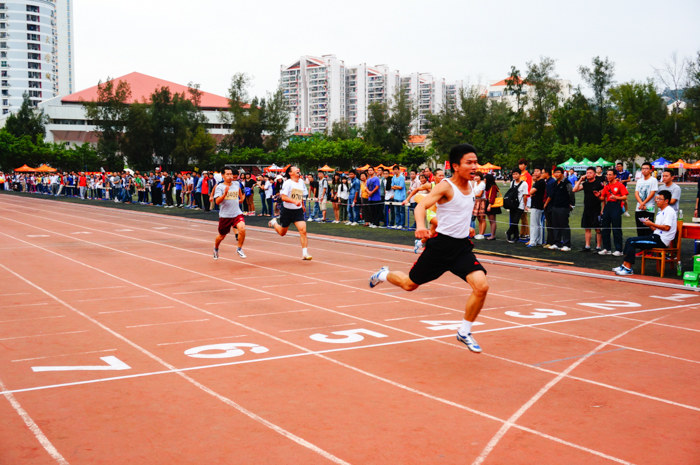 下午四点五十,天空开始飘起小雨。在教职工女子青年组的4X100米接力赛决赛中,老师们奋力冲刺,用巾帼不让须眉的英姿征服了场边的观众。
