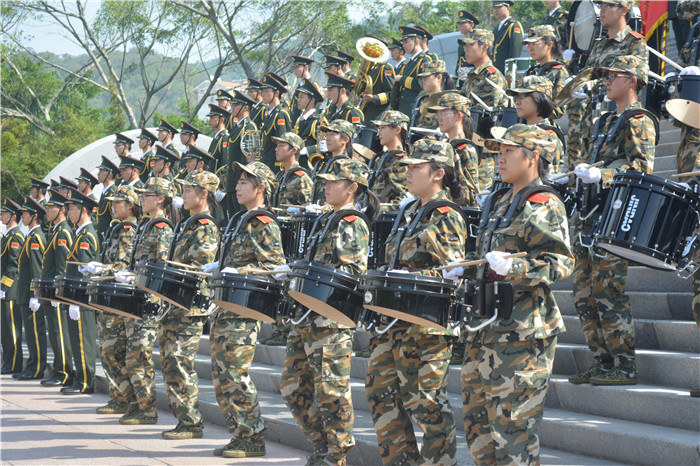 10时许,身着军装、手执乐器的同学们迈着整齐的步伐入场。台阶左侧是由63名来自大二大三的国防生们组成的国防生军乐团,绿军装、黄绶带、白手套,好不意气风发;而右侧则是由28名来自各院系的大一新生在军训时组成的打击乐直属连,熟悉的迷彩服、红肩章,崭新的大小军鼓、多音鼓、大小镲,好一派英姿飒爽。