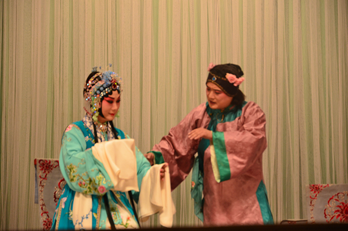 晚上七点三十分,演出正式开始。随着绛红色的幕布缓缓拉开,首先映入观众眼帘的便是韩玉娘和留她寄居的瞿家老妪,一番对话婉婉道来,是大家对玉娘的身世和逃难缘由有了一个初步的了解,也使主人公坚贞不屈,有礼有节的形象豁然开朗。接着,各路人物开始粉墨登场:好色淫荡的纨绔子弟胡为、居心不轨的无良老尼、古道热肠的李氏、胆大心细的程氏家将赵寻纷纷出场,特别值得一提的是程鹏举和韩玉娘这一对苦命鸳鸯的舞台表演:程鹏举由老生演员扮演,唱腔洪亮,一举一动都透着敦厚坚毅的气质;韩玉娘则是标准的梅派青衣,一对水袖舞得好不精彩。除此之外,几名丑角演员也表演的有声有色,为本来略显沉重的剧情增添了一些喜剧色彩。