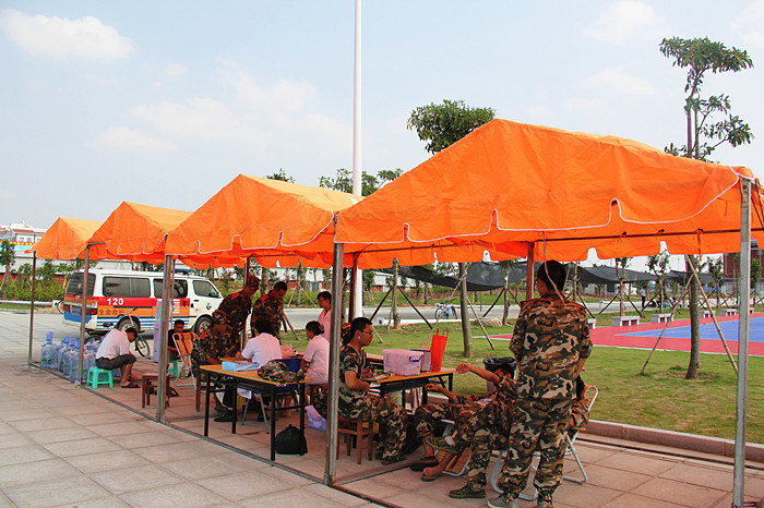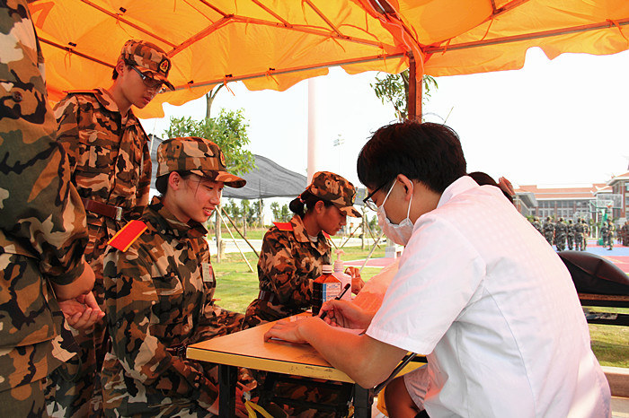 值得一提的是,上午的军训六点二十开始,而六点半的时候,由厦门市第一医院附属同民医院的医生们组成的医疗队便已就位,随时准备为身体不适的同学提供医疗服务。
