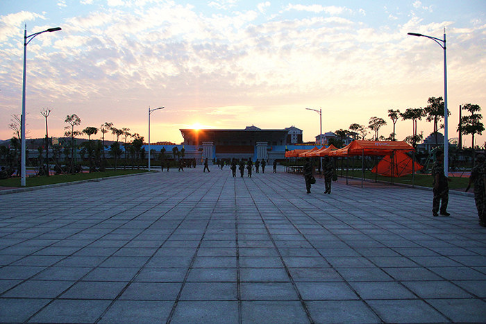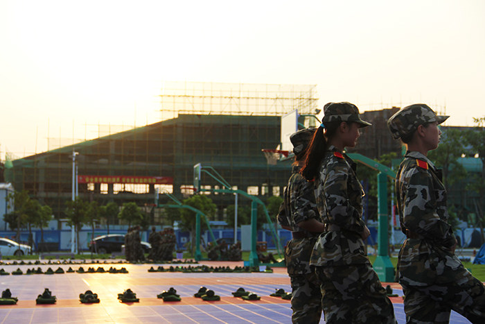 下午六点半,一天的训练进入尾声。由于需要错开吃饭时间,有的连队在将近七点钟才能带回。一天的训练也伴随着夕阳落下帷幕