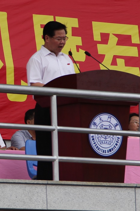 朱崇实校长首先致辞。他提出希望新生们能够在这所拥有“海一样博大胸怀”的学校中,让母校成为自己重要的生活组成部分,将厦大的宝贵精神和优良传统留在自己的生命中。对此,朱校长从走近厦大的历史,感受厦大的文化;学会创新,自觉自主,化被动为主动地学习;学会集体生活,学会与人相处;了解和认识自己,学会独立思考,勇于担当等多个方面对新生提出期许和建议。同时,朱校长高度赞扬了负责本次军训的部队,并强调,军训的意义在于从承训官兵身上学习勇敢顽强、挑战自我、团队协作与组织纪律四项能力,并祝愿同学们能够收获四年美好的生活。