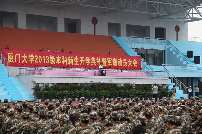 8月29日上午八点,厦门大学2013级本科新生开学典礼暨军训动员大会在厦门大学翔安校区田径场拉开帷幕。出席本次典礼的除了有来自部队的领导以及承训官兵外,还有厦门大学校长朱崇实、厦门大学党委副书记林东伟、校长助理兼翔安校区管委会主任及学生军训工作领导小组常务副组长李初环等学校领导与老师。