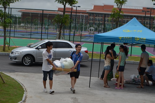首日的迎新高潮出现在上午8点半至11点半之间,学生和家长到达一期时都有相应的志愿者接送,很多同学和家长都感叹校区之大,让大家找不到路。各院志愿者也都很积极,帮忙推行李的、引导的人随处可见。