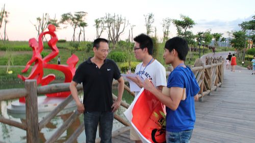在江滨公园入口的广场,怀揣着满满的热情,“我的中国梦”宣传活动正式开始。队员们摆好阵势,拉起横幅,贴好海报,全身心投入到宣传中。一部分队员通过派发传单和口头讲解的形式向民众宣传“中国梦”,其他队员则用便利贴采集民众的中国梦并粘贴到海报上。