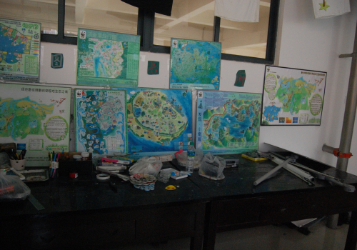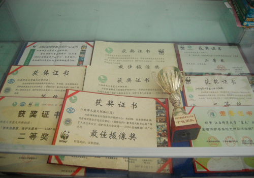 蓝天环保社团十分注重社团文化建设。办公室的墙上,挂满了历次活动的T恤,记录着他们每一次环保活动的点滴;靠墙的几张桌子上,则陈列着几幅手绘生态地图,包括鄱阳湖、洞庭湖、汤逊湖等生态区,均是他们经过实地考察后手工绘制而成;橱柜里,则是他们获得的荣誉证书,以及各种与自然环境相关的文本资料。“法蓝西”到访时,留校的社团成员正围成一圈做着游戏,不亦乐乎。他们把环保灌注于生命,用青春点染大地绿荫,并乐此不疲。