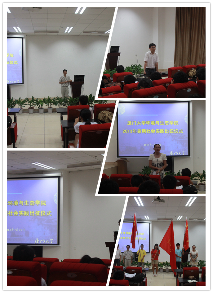 7月25日中午,环境与生态学院2013年暑期社会实践出征仪式在环生楼B103隆重举行。院党委副书记周克夫、许美霞,院团委书记林明华以及全体实践队队员出席活动。仪式由林明华主持。
