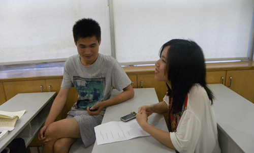 课间之余,队员分别对授课教师和学员就教学方式、内容和效果进行了全面了解。学生们大多对学校培训方式感到满意,从对话中也能获知培训效果不错,学生基本能进行简单的日常对话交流。老师也尝试使用多种方式提高学员学习热情。老师告诉我们:你教学生再多都没有用,要让学生真正的融入到闽南环境中,让他们开口说话,才能真正掌握闽南语的精髓。课堂课间,闽南语环绕教室,使人充满浓浓的亲切感与归属感。