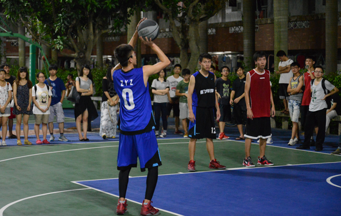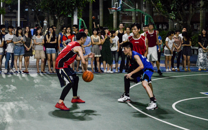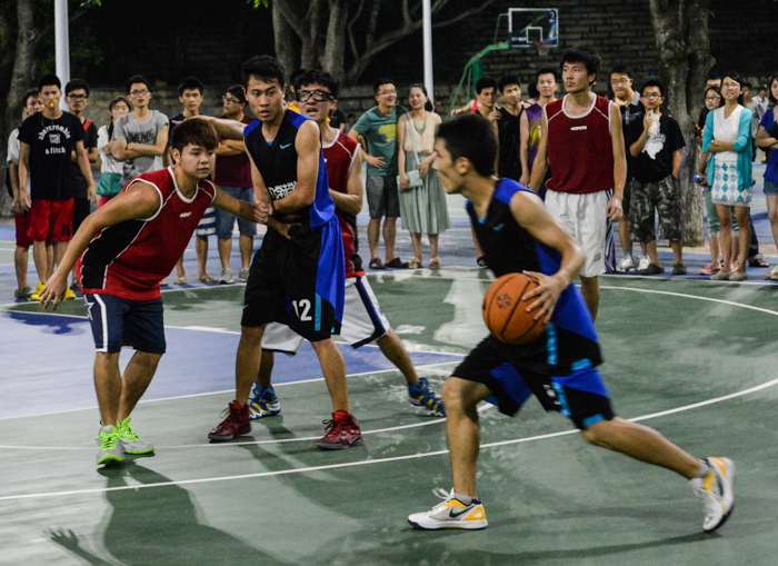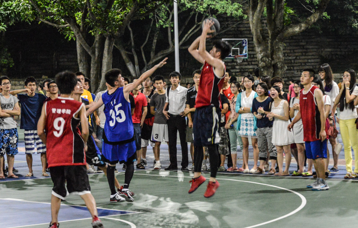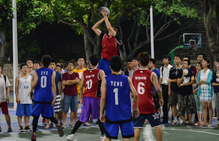 6月27号晚七点,厦门大学“雪津杯”2013篮球超级联赛的第二场半决赛在东苑篮球场举行。对阵双方分别为法学院(以下简称“法学”)和管理学院(以下简称“管院”)。夜幕渐渐降临,双方球员热身合影后,激烈的比赛在哨声中开始了。