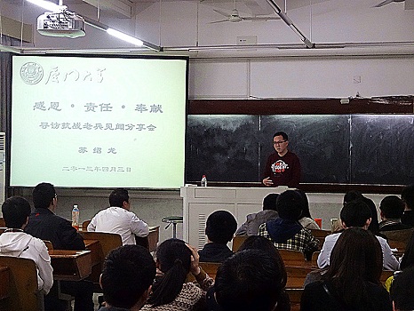 七十多年前,当我们深爱的土地遭到日寇凌辱时,有一群人站了出来,以自己的血肉之躯筑起了民族抵抗的长城。如今,你是否还记得他们?如果你记得他们,你愿意走到他们身边,走进他们的内心世界吗?苏绍龙就是一个“愿意”的人。2013年寒假期间,他组织起一支平均年龄21岁的志愿者队伍,走遍了大理州12个县市2600公里的山山水水,找到并慰问了40位平均年龄93岁的抗战老兵。4月3日,苏绍龙来到厦大,在南强二202教室与母校学子分享了他在寻访过程中的精神体验。