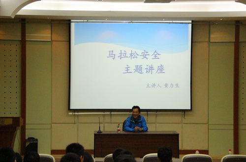 讲座刚一开场,黄老师就提到了今年所发生长跑中的几次安全事故,以此警醒大家一定要注意马拉松比赛过程中的安全问题。“马拉松不可怕,我们需要的只是科学的方法。”黄老师首先从备战入手,在强调了体育运动对于同学们日常生活的重要性后,黄老师由此提出,只要有了适当的锻炼,那“马拉松就是小菜一碟”。这种轻松的心态也让在场的各位参赛选手渐渐放下心来。
