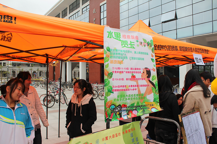 平安夜即将来临,一种提倡环保的祝福方式——水果贺卡开始盛行。该活动由厦门大学翔安校区社团联合会主办,厦门大学环保协会、蔚蓝社承办,于12月11日至13日中午12:00至13:30在翔安校区竞丰食堂前广场开展。第一天便吸引了近百名同学参与。