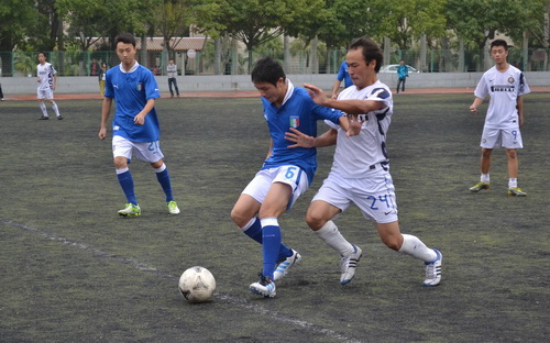 一声哨响后,比赛正式开始。物机在中前场展开凶狠的拼抢,并很快获得本场比赛的第一个角球。其进入比赛的节奏之快彰显了他们强队克星的本色。无论是八强赛时的对手卫冕冠军软件学院,还是本场的主角公事,都对物机开场之后不惜体力的抢劫球表现得很不适应。中后场抢断后的迅速盲目出脚,很难在前场展开有效的组织进攻。直至第7分钟,公事才获得一些机会。左边前卫潘耀进在前场左路突进,9号阮建民在禁区弧顶接球后直塞给插上的达吾,可惜力量稍大传出底线。这也是公事在上半场频繁应用的进攻套路。