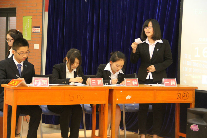 新生辩论赛经过三轮的精彩比赛,终于决出了四支强队。强强对决,比赛场地也自然变成了更适合辩论的舞台——自钦楼多功能厅。在自钦楼明亮的灯光下,身穿清一色正装的两支队伍在五名来自校辩班的评委和近百名来自各院系观众的注视下,上演一场精彩的辩论。