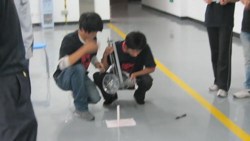 下午一点半,比赛正式开始,赛道旁早站满了老师和前来参观的同学,大家屏住呼气,侧着身子,静静的等待小车稳稳地出场。上场的三位同学拉着卷尺,蹲下身来小心翼翼地铺上坐标纸找准出发位置,将储足能量的小车轻轻地贴上轨道,拨好方向后轻轻放开,小车便像船儿出港,朝着不可靠近的桩缓缓驶去。绕直线桩组这边,来自电气工程及其自动化专业大三的马向辉同学组的小车,从一出发便显露出君临天下的气势,稳定的行进速度,标准的正弦曲线轨迹,将一根又一根桩远远地甩开,引起全场连续的欢呼!以17桩的成绩提前锁定了第一的位置。一直被看好的来自大二机械设计制造及其自动化(以下简称机械)专业曹新城组,经过简短时间的调整,依然稳稳地出发,三位同学紧紧地盯着车子紧追其后,过了第十根桩时,小车开始出现了轻微的偏移,场边的观众都开始吼着“过······!过······!”但三位同学也无可奈何,只能默默地看着自己的小车逐渐偏离轨道,“啪!”,小车顽皮地将第13根塑料桩推倒,便慢慢地逃离了轨道。绕“8”字桩组这边,由于场地原因比赛在老师办公室进行。随后,比赛将桩之间的距离由100cm调至95cm,同学们通过对车进行短时间调整后,继续按顺序比赛。