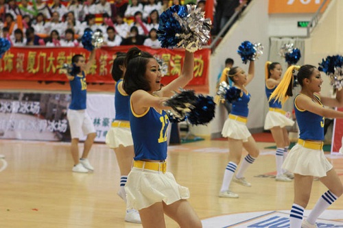 比赛在一片欢声鼓舞中正式开始。公共卫生学院代表队和医学院代表队率先登台表演,他们自信满满,欢腾跳跃,口号嘹亮,十字、菱形等变换的队形令人眼花缭乱;轻盈、欢快的潇洒动作令人赞叹不已。上届啦啦操比赛的冠军得主----法学院代表队,今年以中国风为主打,大红色的队服上配饰着中国结和流苏,女生的中国娃娃头更是娇俏可人。一出场,响亮的口号和拍掌声气势惊人,随即音乐声起,活泼可爱的舞姿在场上掀起了一阵热潮。