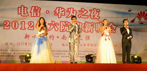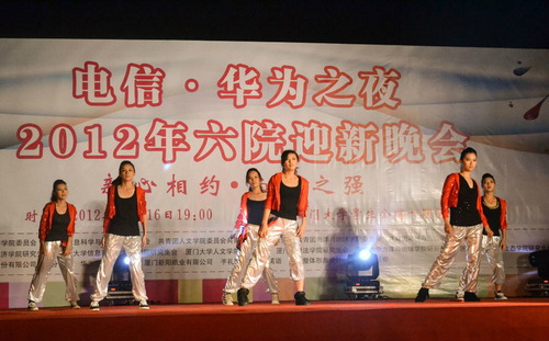 2012年11月16日晚,由厦门大学经济学院、信息科学与技术学院、人文学院、法学院、海洋与地球学院和环境与生态学院共同承办,由中国电信华为技术有限公司协办的迎新晚会在海韵一期篮球场准时开始。六个学院的党委副书记、团委书记和副书记以及辅导员应邀参加了这次迎新晚会。百余名同学们观看了这场精彩的晚会。