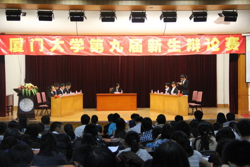“辩天下是非曲折,论世间变幻万象。”11月16日晚七点,由厦门大学团委指导、厦门大学学生委员会主办、厦门大学学生委员会学习学术部承办、厦大辩论学社协办的厦门大学第九届新生辩论赛暨揭幕战在法学院模拟法庭拉开帷幕。厦门大学软件学院团委书记葛学凤老师、共青团厦门大学委员会学生组织秘书长周林琪老师及厦门大学多名校级机构代表作为嘉宾到场,评委则由09级校辩队的学长们担任。