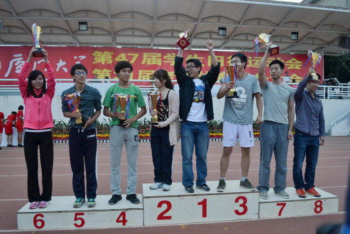 2012年11月3日下午五时,厦门大学第47届学生田径运动会暨第27届老年人体育健身大会完美落幕,闭幕式在厦大演武场隆重举行。总裁判张秀芬依次宣布了各学院本科生、研究生的分数、排名及其总成绩。