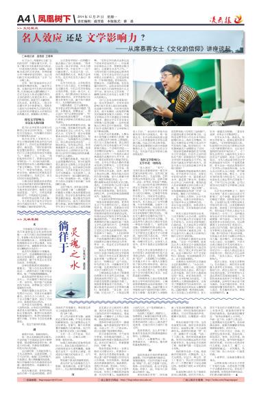 是名人效应,更是文学影响力。在此基础上,我们再去反观厦大诸多的文学讲座,不论引起轰动与否,都会让我们有一种更为乐观的态度。文学的影响力正是在那些花花绿绿的海报下,在那些来来往往的学子中悄然无声地传播着。这种作用未必是可观可感的,但是它确实存在,并且伴随着传播手段的提升,借助名人效应、信息爆炸的宣传,积极地发挥着作用。