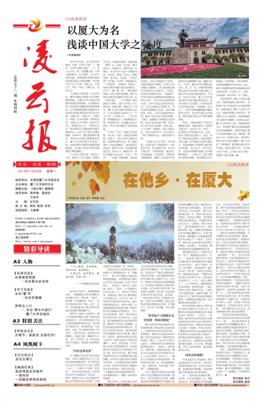 当我们徜徉于厦门大学的大楼之间,欣赏其建筑之美的同时,更有感于校主陈嘉庚先生的爱国精神;当我们授业于厦门大学的大师之手,感悟其智慧之学的同时,更有感于以王亚南校长、陈景润教授为代表的科学精神;当我们活动于厦门大学的学生之间,热爱其奋发之态,更有感于厦大内迁闽西艰苦办学的自强精神;当我们欣喜于厦门大学海外建校之举,佩服其“敢为天下先”的勇气之际,更有感于罗扬才烈士的革命精神。厦门大学的“四种精神”彰显厦大独有的大学气度。我们以厦大之名,思中国大学之气度,以中国大学之气度,思厦大气度之发展。▲