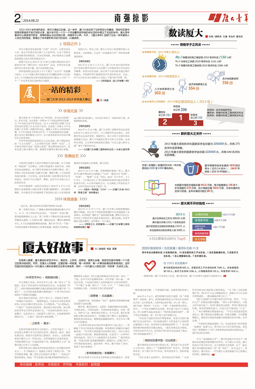 2013-2014学年悄然逝去,南方之强屹立如昔。这一学年,厦门大学迎来了马来西亚分校奠基、翔安校区图书馆落成等诸多可喜可贺的大事,厦大学子在一个又一个洋溢着青春热情的学生活动中度过了充实的学年,厦大青年宣传中心继续恪守职责,用笔和镜头见证校园大事,传播学子心声。今天,《厦大青年》回顾了过去一学年厦青人人网主页的报道,整理出了学年度影响力较大的活动,以飨读者。