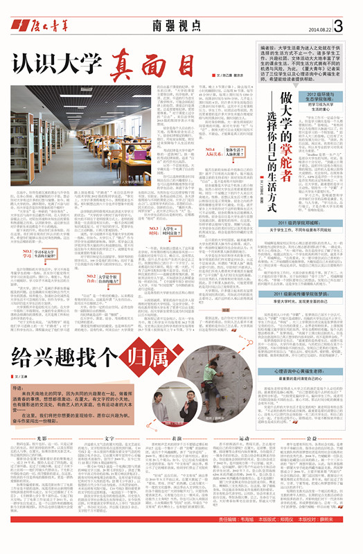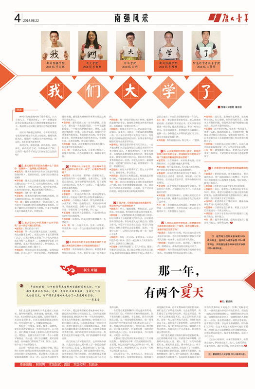 直到考试终了,你们或许这才第一次真切地体验到毕业带来的离别,没有作业,没有考试,在摩肩接踵的聚会和长辈殷切的询问间穿行,继而向往背着行囊奔向未知的大学的种种。而此时的我们已经步入小学期,每天奔波在寝室和教室之间,体验着你们所好奇的经历,课程之余,满心欢喜地期待你们的到来,并努力采写编排彼时你们手中的这份报纸,想将我们所见所感的大学生活第一时间送到你们眼前,忙碌得心甘情愿。