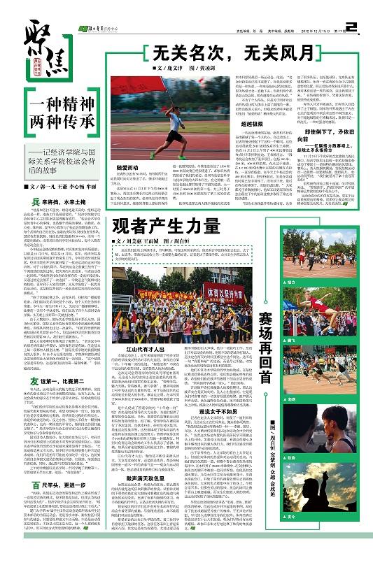 “的确,我们在运动会的管理和运作上确实形成了一套较为完备的模式,很多院都是如此,但我认为改进空间还很大的”。经济学院学生会主席吴家兴坦言,“明年在成绩上如想取得突破,要在运动员的训练上下功夫。”
