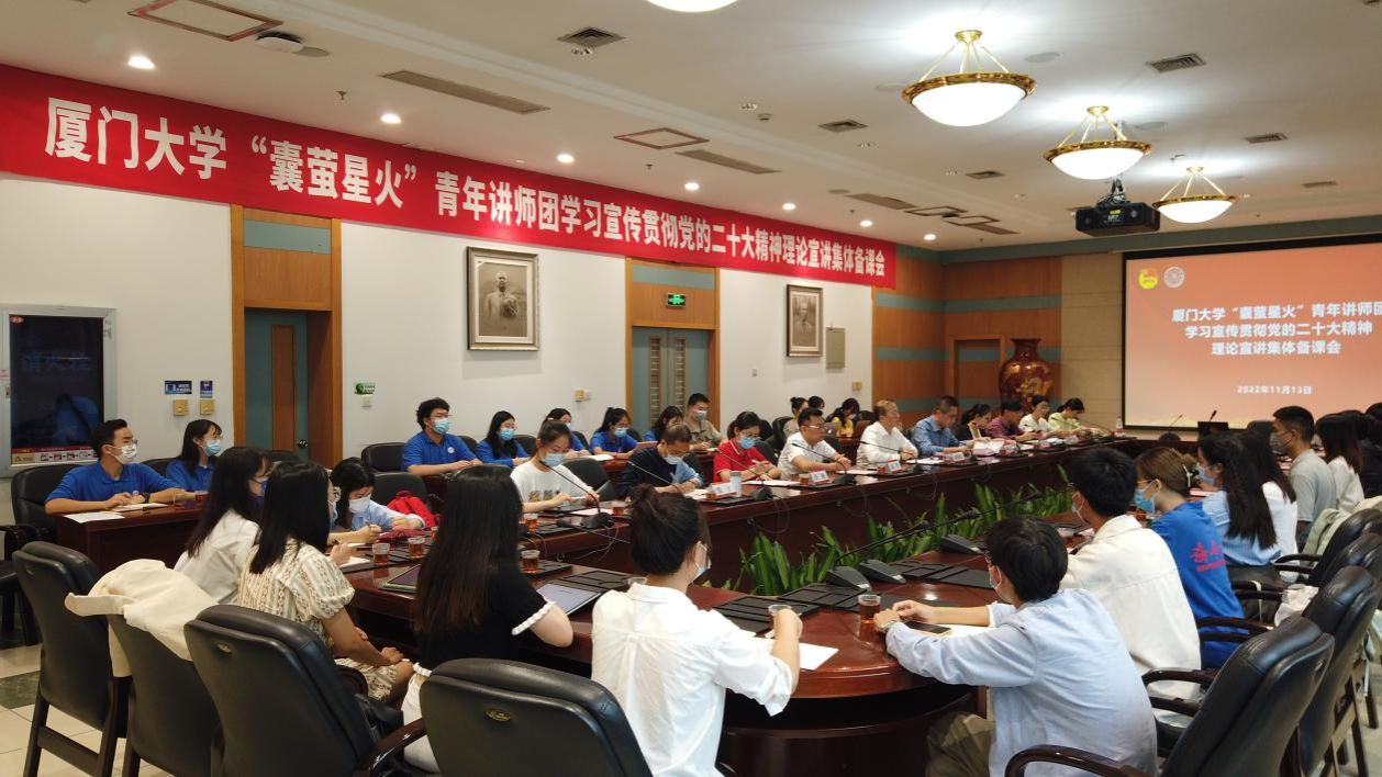 11月13日,厦门大学“囊萤星火”青年讲师团学习宣传贯彻党的二十大精神理论宣讲集体备课会在颂恩楼215会议室举行。校团委书记洪海松出席会议并作宣讲动员,厦门“学习强国”运行中心主任、厦门市委讲师团讲师秦学以《聚焦党的二十大主题:深入领会其中三个“全面”的丰富内涵》为题作理论授课,青年讲师团全体成员参加会议并进行了交流研讨。备课会由校团委副书记梁振伟主持。