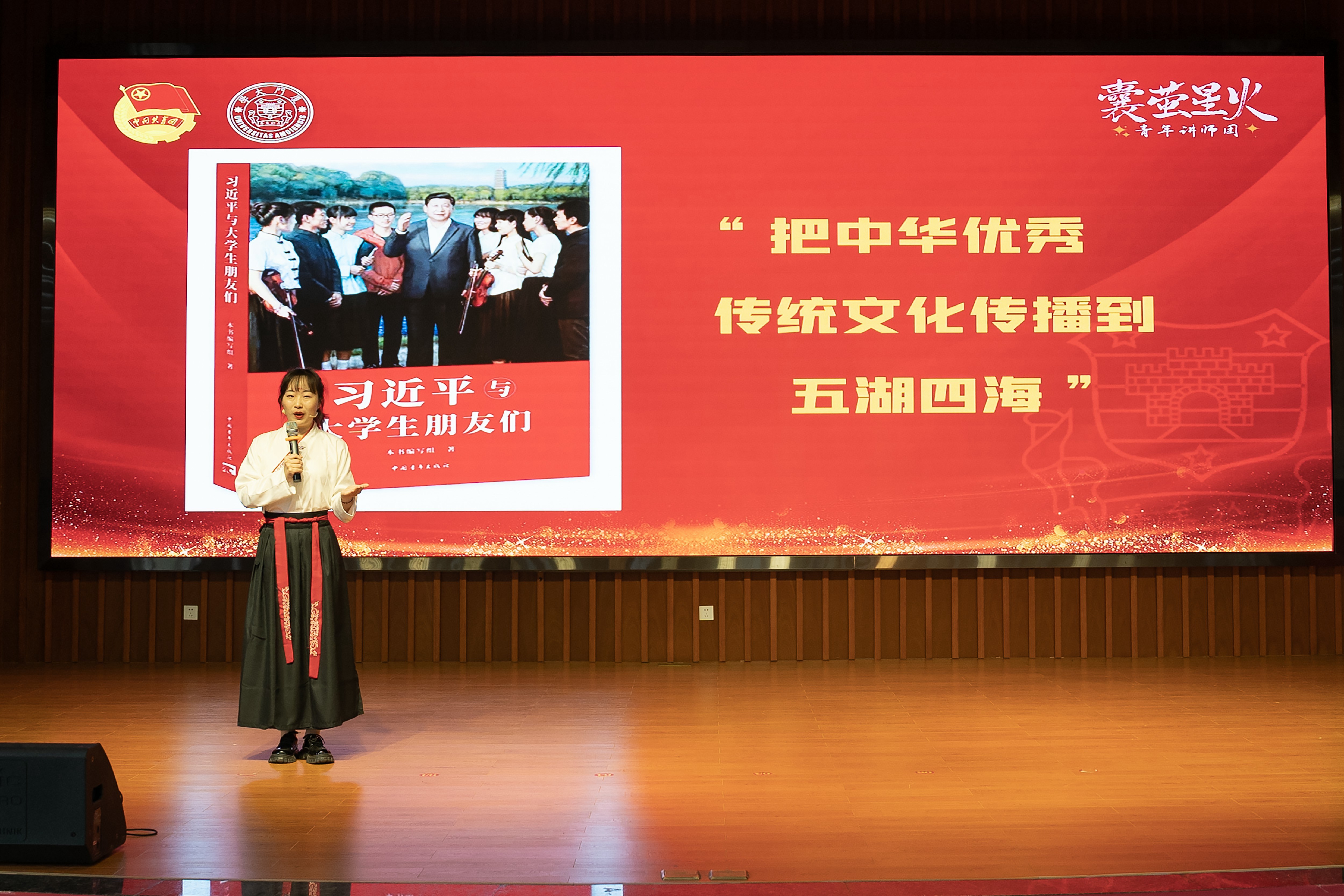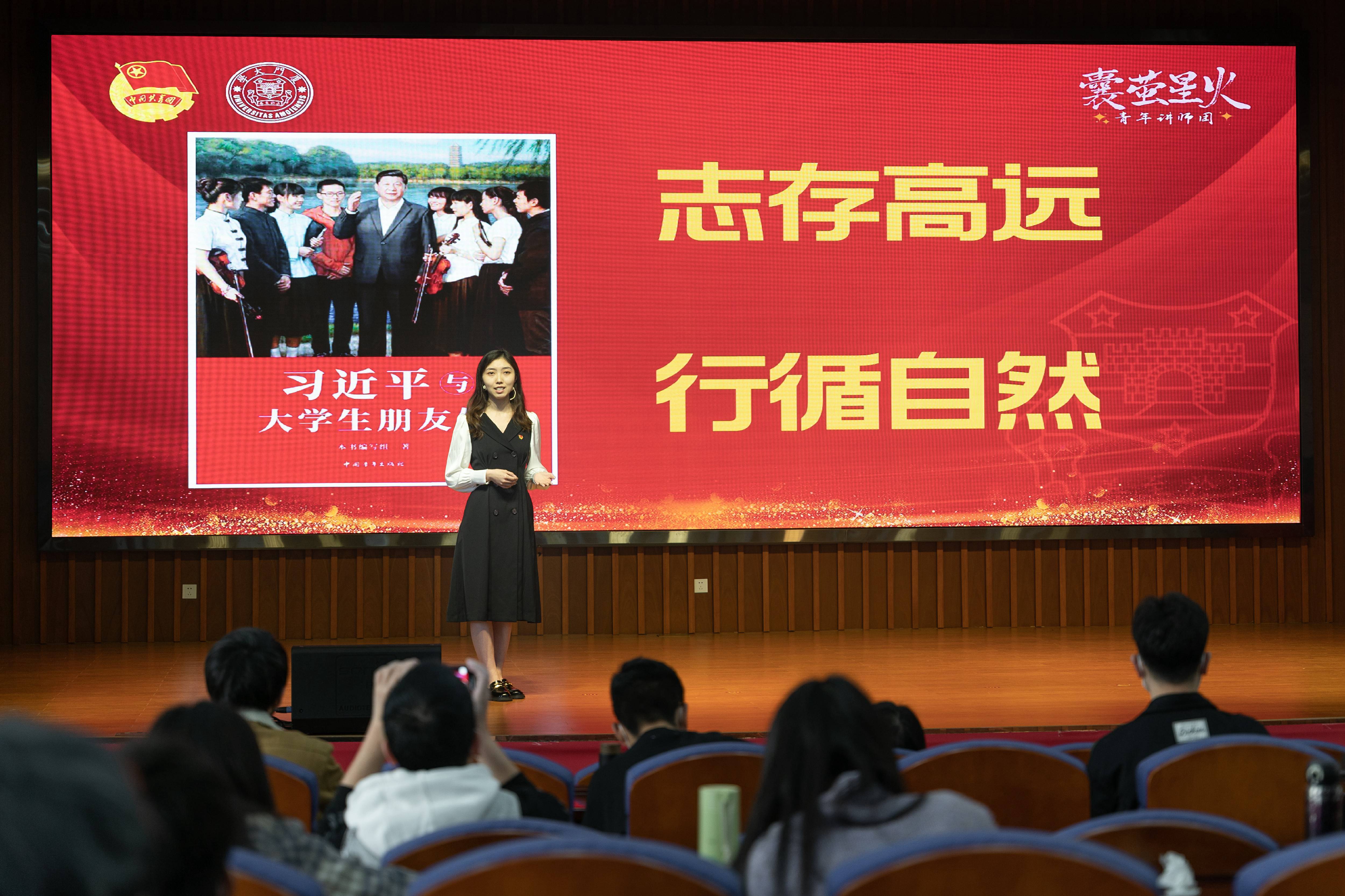 据悉,2021年5月,厦门大学团委发起组建“囊萤星火青年讲师团”,以46名学生骨干为主体,运用青年话语体系,聚焦青年观察思考和时代青春故事,让青年讲给青年听,以朋辈教育唤起青春理想。截至目前,讲师团通过进党校团校、进党团支部、进社区和网络,已累计开展各类专题宣讲188场次,覆盖听众1.6万余人次。